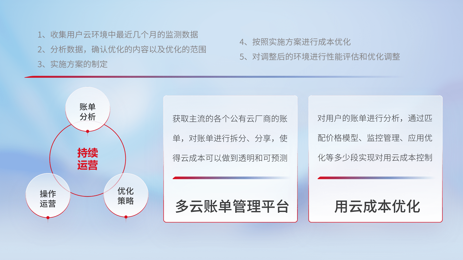 通过多云纳管,,以统一的资源数据模型把客户的云资源进行抽象和封装,,进而实现对多云资源的统一操作,,保障云资源管理的可靠性、、、、稳定性与可用性。。。量身定制化运维内容,,配置、、、开发运维、、、补丁管理、、、备份、、监控、、认证和访问管理、、、、审计和日常巡检等,,保障在用云过程中的可靠度,,稳定度以及高可用率。。。。